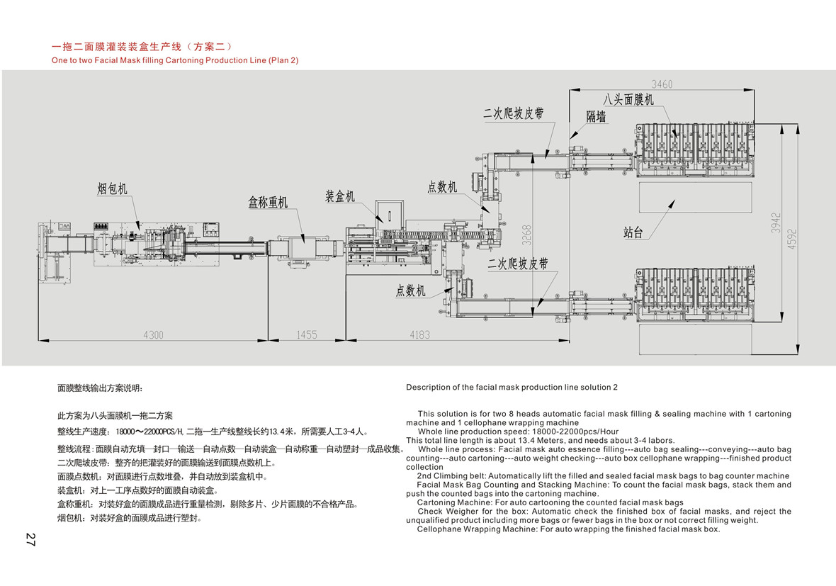 整線流程:面膜自動(dòng)充填一封口一輸送一自動(dòng)點(diǎn)數(shù)-自動(dòng)裝盒-自動(dòng)稱重一自動(dòng)塑封一成品收集,二次爬坡皮帶:整齊的把灌裝好的面膜輸送到面膜點(diǎn)數(shù)機(jī)上。面膜點(diǎn)數(shù)機(jī):對(duì)面膜進(jìn)行點(diǎn)數(shù)堆疊,并自動(dòng)放到裝盒機(jī)中。裝盒機(jī):對(duì)上一工序點(diǎn)數(shù)好的面膜自動(dòng)裝盒。