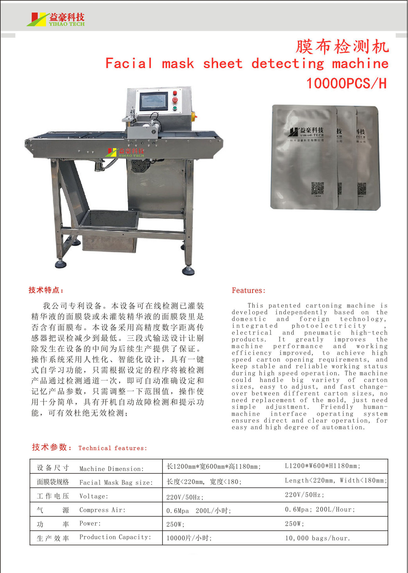 我公司專(zhuān)利設(shè)備。本設(shè)備可在線(xiàn)檢測(cè)已灌裝精華液的面膜袋或未灌裝精華液的面膜袋里是否含有面膜布。本設(shè)備采用高精度數(shù)字距離傳感器把誤檢減少到最低。三段式輸送設(shè)計(jì)讓剔除發(fā)生在設(shè)備的中間為后續(xù)生產(chǎn)提供了保證。操作系統(tǒng)采用人性化、智能化設(shè)計(jì),具有一鍵式自學(xué)習(xí)功能,只需根據(jù)設(shè)定的程序?qū)⒈粰z測(cè)產(chǎn)品通過(guò)檢測(cè)通道一次,即可自動(dòng)準(zhǔn)確設(shè)定和記憶產(chǎn)品參數(shù),只需調(diào)整一下范圍值,操作使用十分簡(jiǎn)單,具有開(kāi)機(jī)自動(dòng)故障檢測(cè)和提示功能,可有效杜絕無(wú)效檢測(cè)